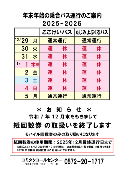コミタクモビリティサービス株式会社が運行しております乗合バスの年末年始の運行につきまして、下記のとおりとさせていただきます。